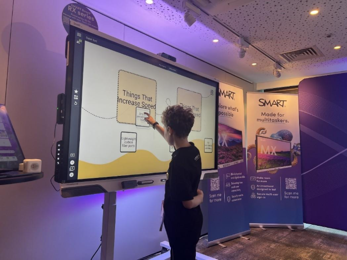 First, I tried a SMART Board that was using software called Lumio, and it was honestly amazing. Mark from SMART showed us how he could make a whole lesson in less than a minute using Lumio’s AI tools. He typed in an idea about the science behind Formula One cars, and the lesson suddenly appeared with activities, things to drag around, and videos built in. It was because Lumio can make full interactive lessons from a simple prompt, which must save teachers loads of time!